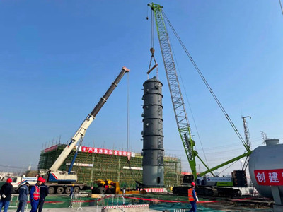 二甲醚反應器為二甲醚工段的核心設備,其將上游來的物料甲醇經二甲醚反應器在催化劑作用下脫水制成二甲醚,為裝置主工藝的起點,亦為下游羰基化工段提供關鍵反應物料。二甲醚反應器總重約90噸,主吊使用260噸履帶吊,300噸汽車吊溜尾,經過1小時吊裝,設備平整就位。