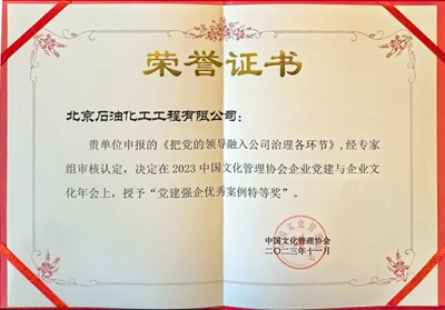 北京石油化工工程有限公司榮獲“黨建強(qiáng)企優(yōu)秀案例特等獎(jiǎng)”。公司持續(xù)夯實(shí)黨建基礎(chǔ),塑強(qiáng)黨建品牌,筑牢紅色堡壘,打造特色黨建文化,營(yíng)造濃厚黨建氛圍。