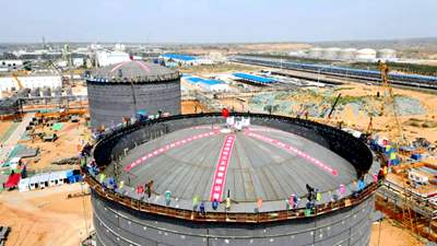 7月14日,由北京石油化工工程有限公司EPC總承包的延長石油靖邊天然氣儲氣調(diào)峰及配套LNG項目兩臺5萬立方米大型液化天然氣儲罐穹頂氣頂升作業(yè)圓滿完成,標志著外罐主體結構建設完畢,全面轉(zhuǎn)入內(nèi)罐安裝階段,為項目后續(xù)建成中交奠定了堅實基礎。